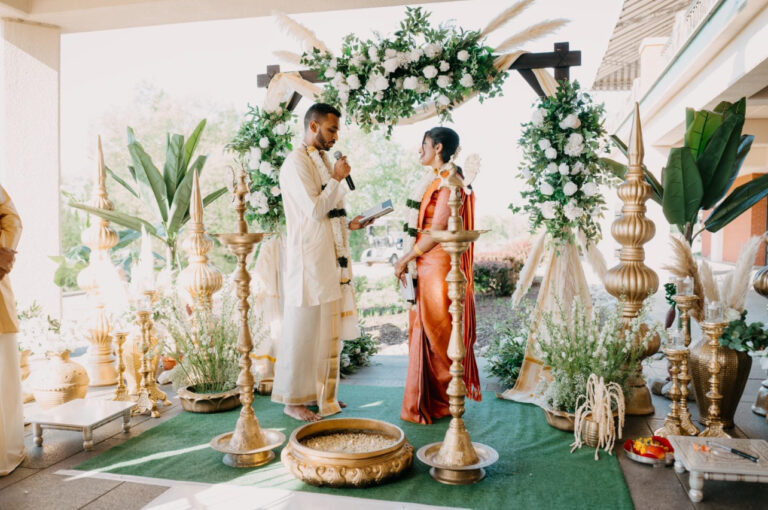 Set against sweeping views of the golf course in the gentle warmth of May, the décor reflected the serene beauty of South Indian celebrations. A refined palette of ivory, soft greens, and warm gold tones created a calm and welcoming atmosphere, while traditional elements such as brass accents, jasmine florals, and natural textures added cultural depth without overwhelming the space.
