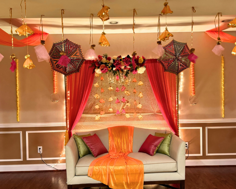 Colorful fabrics were draped across the ceiling, creating a warm, immersive canopy that instantly elevated the space. A custom backdrop and photo-op wall were designed to reflect the couple’s preferences, adding personality and creating joyful moments for guests to capture and remember.