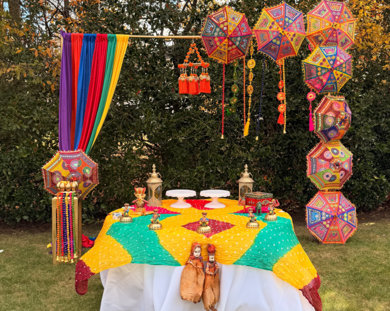 Layered draped fabrics, bandhani patterns, handcrafted accents, and traditional hangings created visual depth and movement, evoking the warmth and celebratory energy of a desert palace gathering. Jewel-toned textiles and ethnic details framed the space, allowing guests to feel immersed in a setting that honored heritage while remaining elegant and inviting.